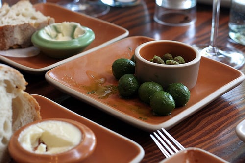 Our meal started with a few “bites”: olives marinated in mizuna pesto, Spanish marcona almonds toasted with sea salt and lavender, and my favorite, a neat (and copious) stack of chickpea fries with piquillo romesco, which reminded me of my beloved panisses.