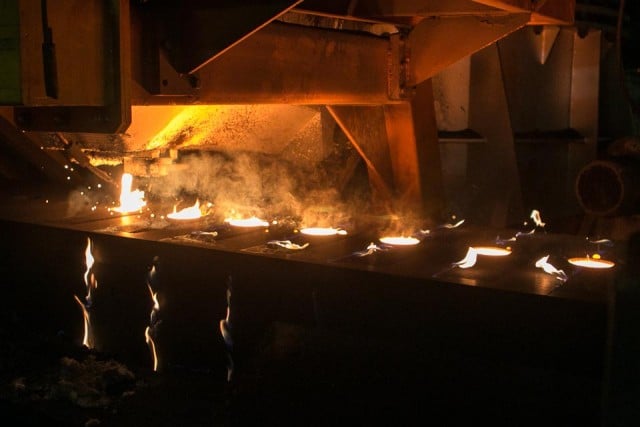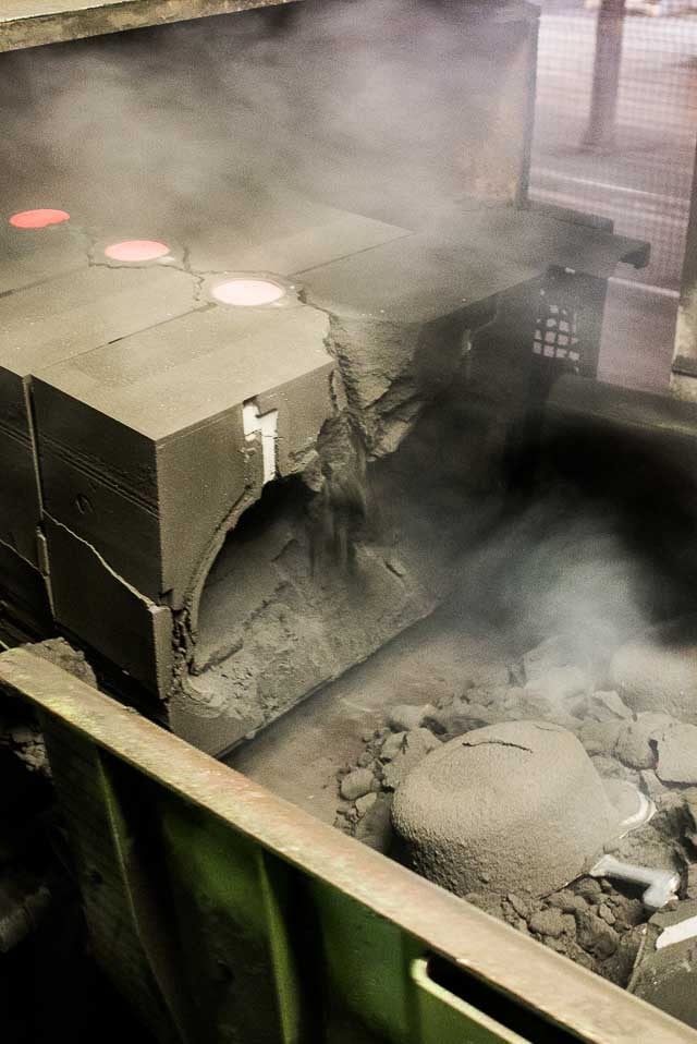 After the pots are released, the sand gets cleaned and reused, and each piece is brushed partially clean and inspected for flaws. Duds get tossed back into that fiery inferno, melted down, and cast again.