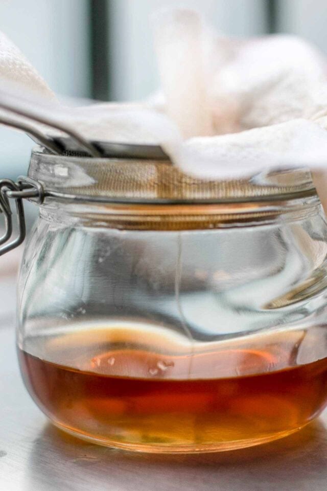 - After three days, place the jar of bourbon in a saucepan with an inch or two of water in it. Very gently start to warm the bourbon over low heat in the water bath. As soon as the hard disk of butter on top is removable, lift it out (reserve it for another use, see Note at end of recipe). Line a funnel with a few layers of cheesecloth, a paper towel or coffee filter, set over a clean jar. Strain the bourbon into the jar. Chill the bourbon until ready to use.