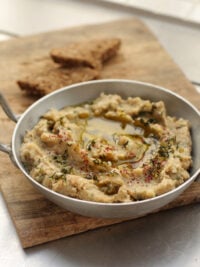 - To serve, spoon into a bowl and make a well in the center. Pour a bit of olive oil in the middle and sprinkle with chili powder, sumac, or some chopped fresh herbs. Crisp toasts, crackers, or pita triangles are good accompaniments.