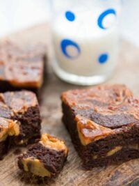 One thing I did learn from making this over and over again is that one shouldn’t use an enameled cast-iron saucepan, which possibly holds heat too well, and the batter doesn’t emulsify and smooth out as effectively. So use a metal pan. Also I originally made them in a 9-inch (23 cm) square pan but decided I like the brownies better in a smaller pan so they’re a little thicker.