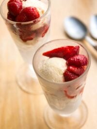 For me, it’s impossible to come home with just one basket. And when the season hits in full force, I gladly buy more, and churn them into strawberry frozen yogurt. It’s very easy to make and unlike strawberry ice cream, you don’t need to do any cooking. It can easy be made in a blender or food processor and takes just minutes.