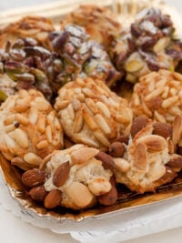 I went inside and found a glass showcase full of treats, include some elaborately glacéed cakes made of almond paste (a specialty of Sicily), and a great variety of cookies. My favorite was the quaresimale. I have a recipe for crispy ones in Ready for Dessert, but the ones here were soft nuggets made with dried fruit and crackly almonds. I know better than to pick a fight in Sicily, and since theirs were so good, I didn’t ask.