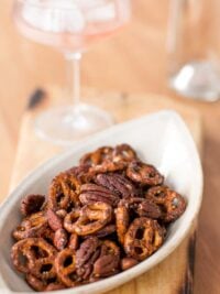 When I moved to France, I had a bit of a time finding the small twisted pretzels that I prefer in this mix, so I’ve made it with pretzels sticks too, which are called ‘sticks d’Alsace.’ย Use any mix of nuts you want. Pecan halves are particularly appealing…at least to me, since those are the nuts I catch myself plucking out before my guests arrive.ย But whole almonds, cashews, peanuts, and hazelnuts are all very good in the mix.