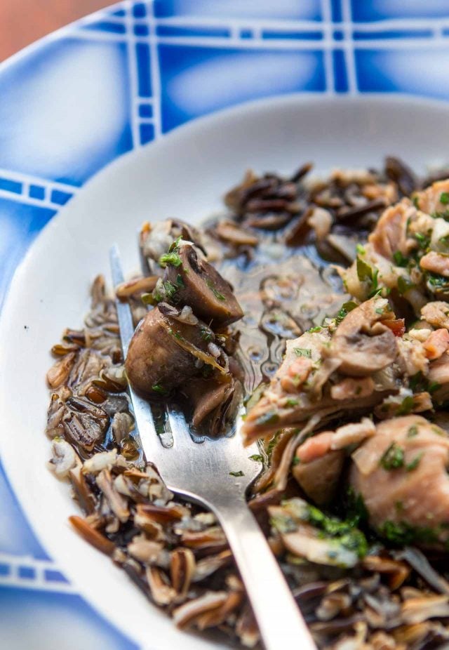 You don’t have to wait for November to serve turkey and since it’s a lighter meal, I sometimes make it at other times of the year. One hefty leg and thigh portion is enough for a meal at home with leftovers, which is just the kinda thing I like; leftovers the next day for lunch. Romain loves wild rice and I had a bag I brought back from the States and made it, which makes something as ordinaire as turkey, something special. A little bacon in the mix didn’t hurt either.