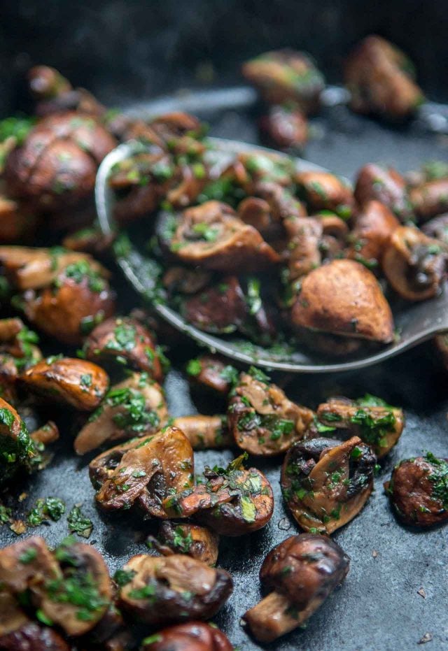- While the sauce is reducing, in a separate wide skillet, melt the butter over high heat. Add the mushrooms, season with a little salt and pepper, and continue to cook, stirring occasionally, until they are about three-quarters of the way cooked through. Add the garlic and minced thyme, and continue to cook until the mushrooms are browned and completely cooked through. Turn off the heat and add chopped parsley and a squeeze of fresh lemon juice.