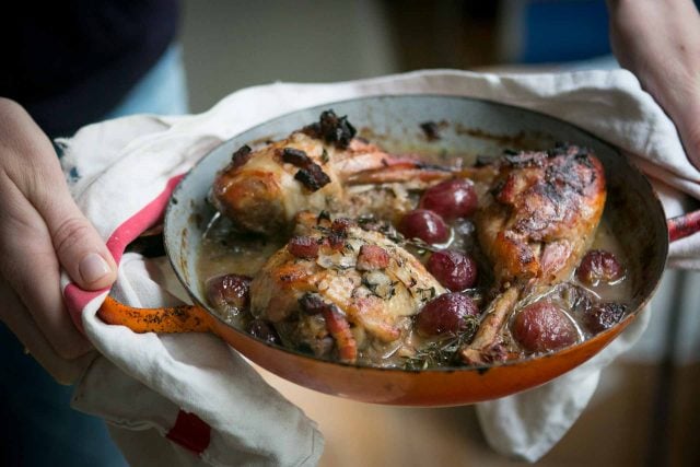 Seedless grapes are rare in France, and most people don’t mind the seeds. (Although they seem to be a little more refined about getting them out of their mouth than I am.) Wherever you are, find a grape variety that tastes good, if you can. In the U.S., Concord or Niagara grapes are very flavorful, or muscat. Of course, since this is a wine harvester’s meal, any grapes used for making wine are appropriate. But you could use Red Globe-style grapes, and count on the bacon-powered braising liquid to give them a boost of flavor.